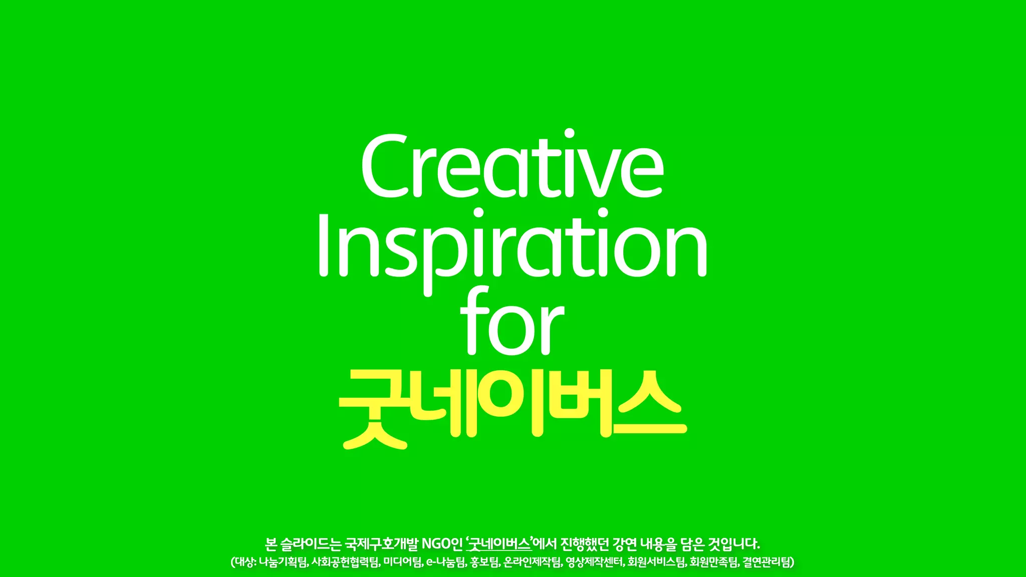 본 슬라이드는 2013년 5월 30일, 국제구호개발 NGO인 ‘굿네이버스’에서 진행했던 강연 내용을 담은 것입니다. (대상: 나눔기획팀, 사회공헌협력팀, 미디어팀, e-나눔팀, 홍보팀, 온라인제작팀, 영상제작센터, 회원서비스팀, 회원만족팀, 결연관리팀)
