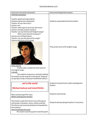 1) The document outlines a teaching manual for a lesson on the song "We Are the World" by Michael Jackson and Lionel Richie. It details the objectives, prerequisites, teaching procedures, resources, and assessment for the lesson.
