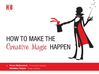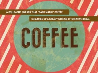 The document provides tips for generating creative ideas when inspiration is lacking. It suggests clearing your mind by stepping away from your desk, revisiting past successful ideas, thinking outside the box by getting outside the office, eliminating negative thinking, looking for inspiration from others, keeping an open mind to new perspectives, and consuming a wide range of content from different sources. The last tip encourages identifying your own "magic wand" or tool that helps make your creative magic happen.