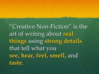 The document introduces the concept of creative non-fiction through the guidance of Julie Judkins, emphasizing the use of sensory details to describe real experiences and favorite places. It includes multiple examples from the book 'I Know Here' by Laurel Croza, highlighting vivid imagery and personal connection to locations. The document encourages readers to think about how their favorite place would be described in writing and to practice their descriptive skills.