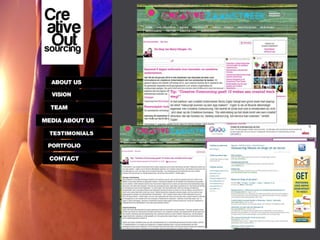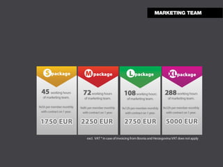 This document summarizes an Amsterdam-based creative production agency that was founded as a branch of a full marketing agency in Sarajevo, Bosnia and Herzegovina. It offers a wide range of creative services including graphic design, video production, web design, mobile apps, photography, and more. It works with both international and local clients in the Netherlands and Bosnia and Herzegovina.