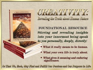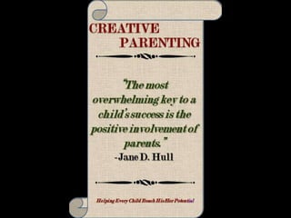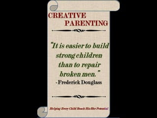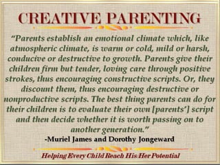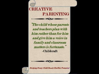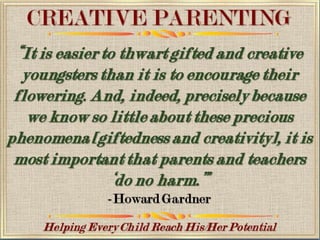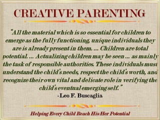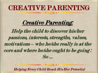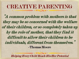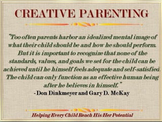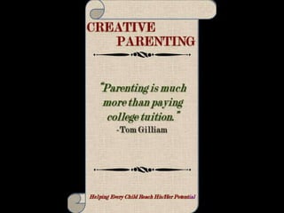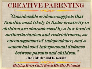 The document discusses the concept of creative parenting, emphasizing the importance of enabling every child to reach their full potential. It highlights the value of childhood fantasies and imaginative activities as normal aspects of a child's development. The text cites E. Paul Torrance, advocating for a positive view of children's imaginative play.