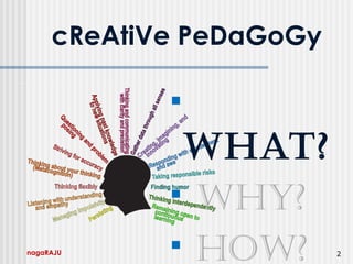 The document discusses creative pedagogy, which is the art and science of creative teaching. It aims to teach learners how to learn creatively and produce creative thinkers. The key aspects of creative pedagogy are helping learners think imaginatively, learn creatively, and fostering a creative classroom environment where students are curious, flexible, and experimental. The document provides tips for teachers to foster their own creativity and create a classroom environment conducive to creativity.