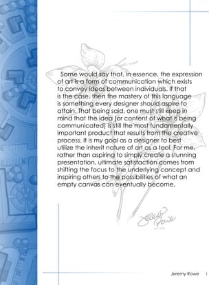 This document is Jeremy Rowe's creative portfolio, which includes samples of his graphic design, illustration, photography, and 3D modeling work. It contains 10 sections that provide examples and brief descriptions of Rowe's skills and experience in areas like caricatures, cartooning, sketching, graphic design for FedEx Office, photo manipulation in Photoshop, 3D modeling in SketchUp, and more. The portfolio is intended to showcase Rowe's broad creative abilities and qualifications for design-related positions.