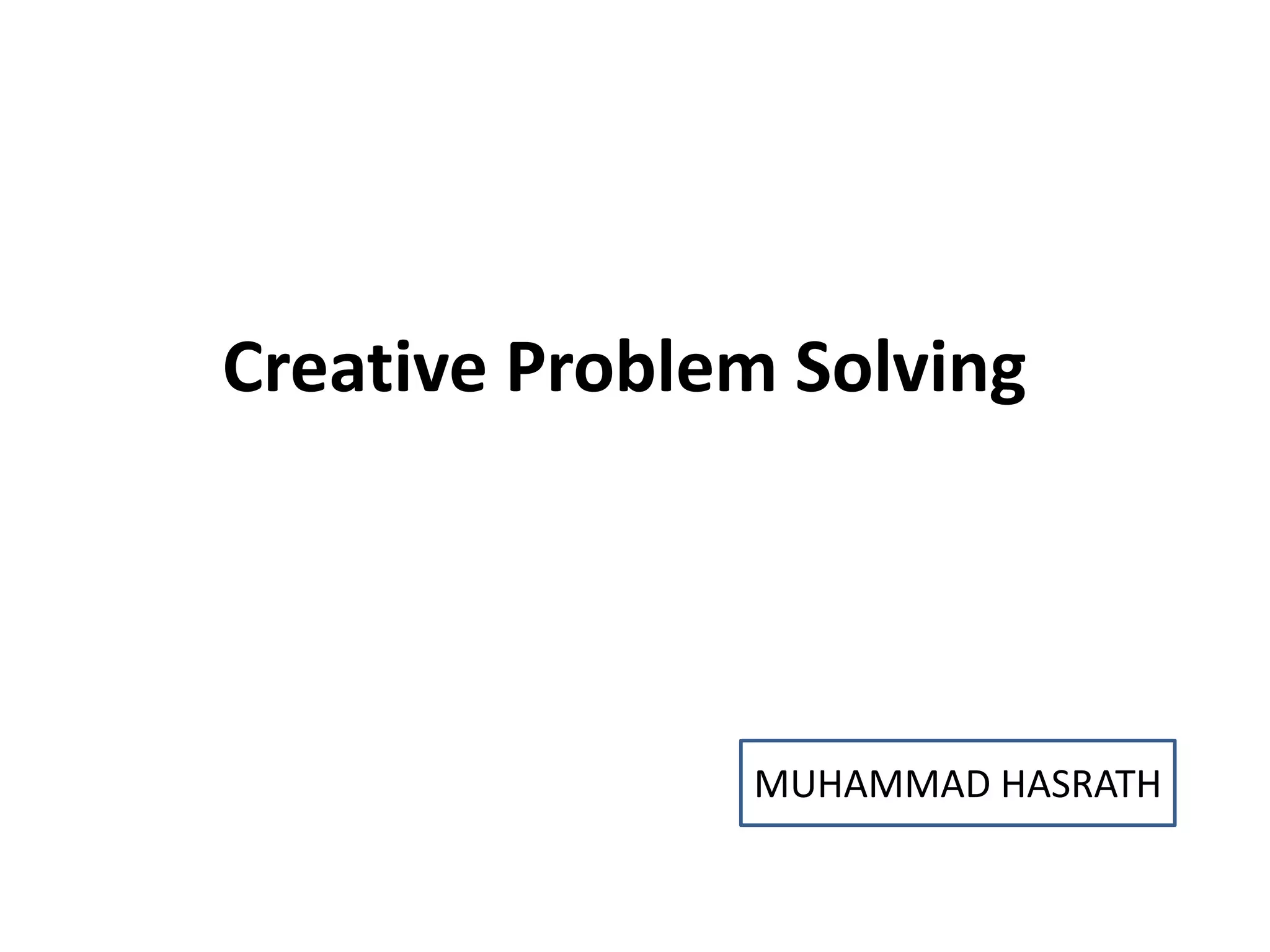 Creative problem solving involves generating innovative solutions rather than standard procedures. It uses tools like problem restatement to broaden perspectives, SWOT analysis to focus on strengths and opportunities, and brainstorming to produce radical ideas without criticism. Idea generation methods include SCAMPER, brainstorming, mind mapping, role playing, and brainwriting to facilitate creative thinking. These techniques aim to reduce inhibitions and connect ideas in new ways to address challenges.