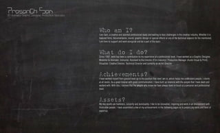The document is a comprehensive overview of a professional named Sam, detailing his extensive experience in the creative industry as a 3D animator, graphic designer, and production specialist since 1997. It lists his various roles, achievements, and contributions to different projects, showcasing his skills in graphic design and multimedia. Additionally, the document highlights his assets and working philosophy, emphasizing communication, innovation, and teamwork.