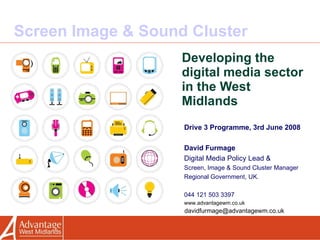 The document discusses the development of the digital media sector in the West Midlands region of the UK. It outlines recent achievements like funding programs for film, games, and digital media. It proposes launching a £5 million Digital Media Fund to back commercial growth in the region. The presentation seeks feedback on priorities for resources and on simplifying business support and targeting high-growth digital markets.