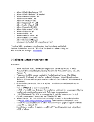 This document provides instructions for installing Adobe Creative Suite 5 Master Collection. It includes a list of the software components, minimum system requirements, and step-by-step instructions for installing from DVD or downloading files. Instructions are provided for installing the Creative Suite applications, 32-bit support package for Windows, and Acrobat 9 Pro.