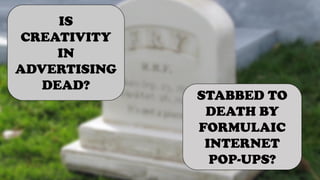 This document discusses the state of creativity in advertising and provides examples of creative Indian advertising campaigns. It argues that while algorithms and technologies have made advertising more data-driven, creative campaigns that tell stories can still be highly effective at connecting with customers and increasing brand recall and sales. Examples are provided of Indian brands like Titan, Amul, Fevicol, and Cadbury that used humor, context, catchy tunes, or interactive elements in their advertising to successfully promote their products and grow their brands. The conclusion is that no matter how advanced technologies become, there will always be room for human creativity in advertising.