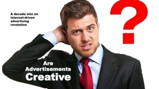This document discusses creative advertising campaigns from the past decade. It begins by noting the shift from art directors to data-driven "all science, no art" approaches. It then highlights 6 campaigns that stood out for their clever, creative ideas: 1) Variations on a meme, 2) Advertisements as games, 3) Crowdsourcing ideas, 4) Just enough humor, 5) A new social movement, and 6) Ads that blend seamlessly into content. Specific campaigns highlighted include National TV spots for Old Spice that increased sales 233%, an interactive game for Vodafone that engaged over 3.8 million people, and Oreo's user-generated "Daily Twist" campaign that boosted Facebook engagement