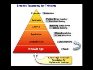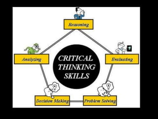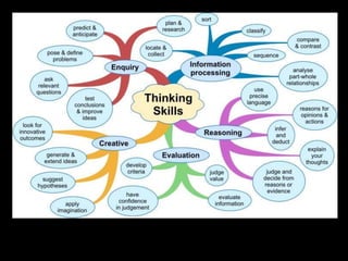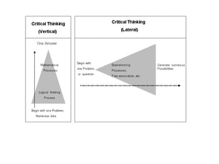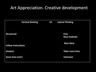 The document discusses various aspects of the creative process in art including vertical versus lateral thinking, thinking skills, and models of creative thinking proposed by Edward de Bono and Louis Raths. It provides examples of exercises to develop lateral thinking and outlines the typical stages involved in an art project from conceiving an idea to the final exhibition. Thinking skills like reflection and logical analysis can help focus creative thinking.