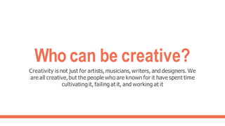 This document provides tips and strategies for cultivating creativity. It discusses that creativity is not just for artists and that everyone has creative abilities that can be developed through practice and failing. Some ways discussed to improve creativity include practicing divergent thinking through lateral thinking puzzles and remote associate problems. It also recommends taking breaks when stuck on a problem, listening to comedy, giving yourself restrictions, and using Edward de Bono's Six Thinking Hats technique to foster creativity in groups. The overall message is that creativity can be cultivated through various exercises and by creating an environment where creative ideas can emerge without judgment.