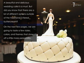 The document discusses creative options for wedding cakes beyond traditional designs, showcasing various styles such as whimsical, high fashion, and garden-themed cakes. It emphasizes personalization through unique flavors, designs, and cake toppers, including alternatives like bundt cakes and cupcakes. The importance of a wedding cake as a central element of a couple's celebration and style is highlighted.
