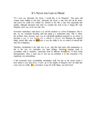 Alexander the Great admired Diogenes' simple, free life without possessions despite having wealth and power. Modern marketing tries to equate products and material things with happiness, but this causes people to hoard stuff and tie their identity to objects. True happiness comes from being in control of oneself, as Diogenes understood. Decluttering by organizing one's surroundings can help sort out emotional baggage and inner feelings. The author has started decluttering and getting rid of meaningless things they have accumulated.