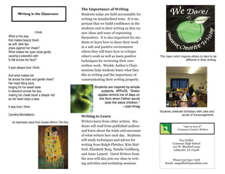 The document provides information about a creative writing course offered at Comeaux High School taught by Ms. Guillot. The class will engage students in various writing activities like writing exercises, reading peer works, creating portfolios, and entering writing contests. Students will learn writing techniques, give and receive feedback, and publish their works. The course aims to develop students' writing and self-expression in a supportive environment. It is open to 10th, 11th, and 12th grade students who obtain a recommendation and submit an application with writing samples.