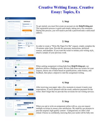 This document provides instructions for creating an account and requesting writing assistance on the HelpWriting.net site. It outlines a 5-step process: 1) Create an account with a password and email. 2) Complete an order form with instructions, sources, and deadline. 3) Review bids from writers and choose one. 4) Review the completed paper and authorize payment. 5) Request revisions until satisfied. The document emphasizes that original, high-quality work is guaranteed or a full refund will be provided.