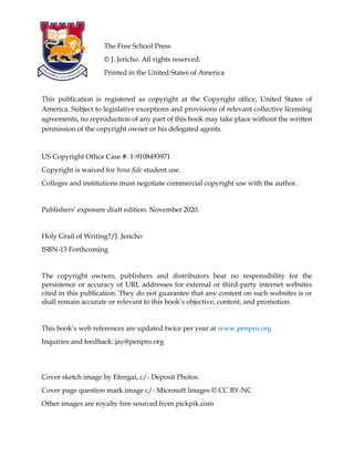 The document titled 'Holy Grail of Writing' by J. Jericho discusses the importance of understanding personal writing objectives for success in the writing field. Through anecdotes, particularly involving a fictional character, Luke Applebee, it highlights how clarity in one’s goals can enhance a writer's career and personal fulfillment. The book serves as both a guide for writers to define their purposes and a reflection on the broader implications of writing in various contexts.