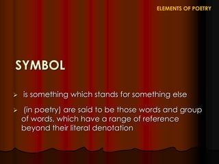 This document discusses various elements of poetry including symbols, structure, and themes. It provides examples of symbolic objects, colors, and flowers and their meanings. Structure in poetry can include alphabetic sequence, haiku, and free verse forms. Poems are often organized into stanzas and different verse forms like couplets, tercets, and quatrains. A theme is the overall statement or meaning behind the poem. An example poem by Langston Hughes about Coney Island uses sensory details to convey the theme of life being like rotten or sick things.