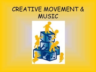Creative movement is a form of expression that prioritizes communication through body movement rather than technique, fostering children's self-awareness, imagination, and coordination. The document outlines various dance concepts, teaching strategies, and activities aimed at enhancing children's engagement with music and movement, including a 'whale dance' and employing multiple intelligences in learning. Additionally, it provides guidance on selecting appropriate songs for children, effective ways to teach music elements, and ideas for transitions during activities.
