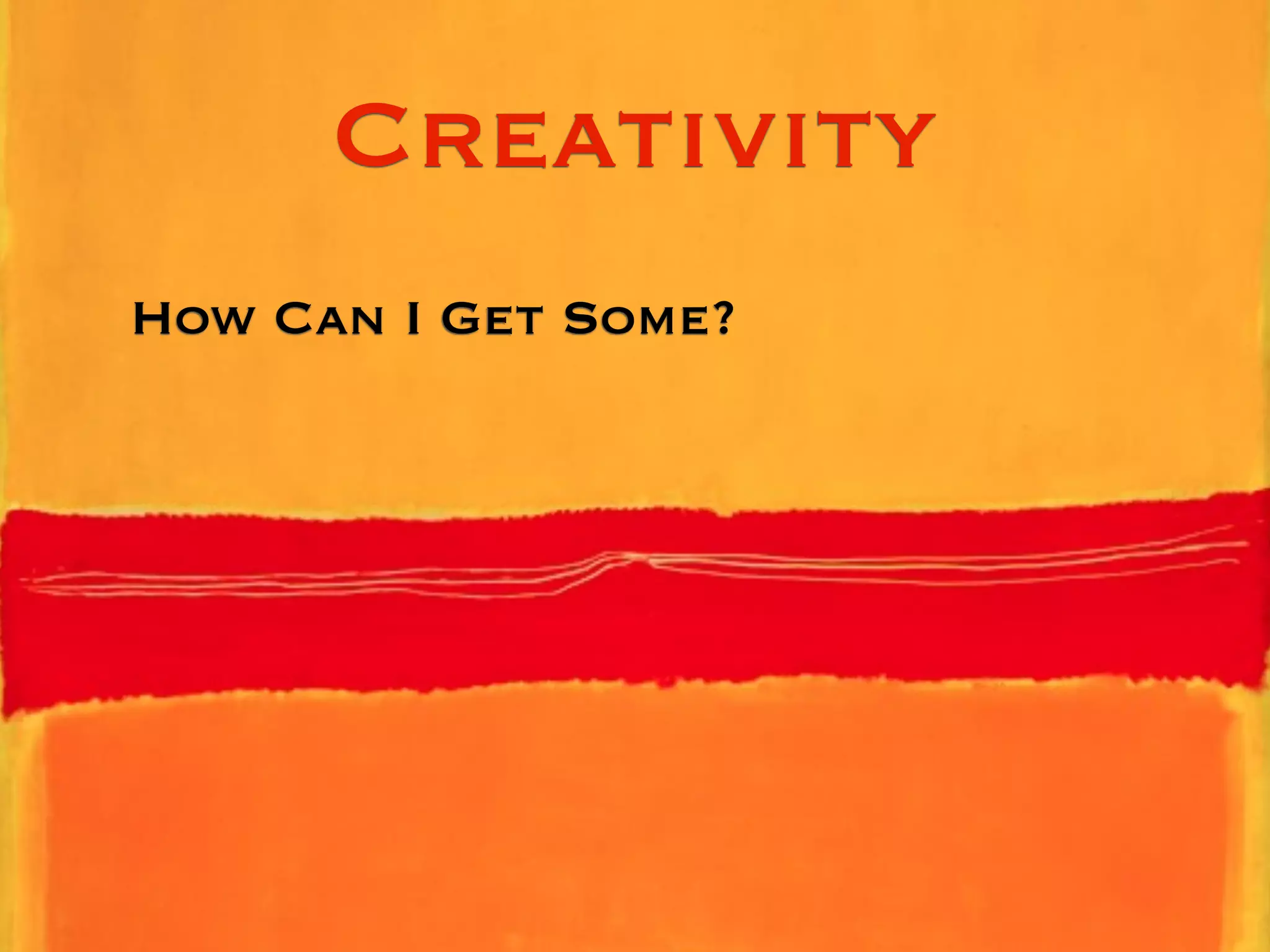This document discusses ways to increase creativity. It argues that creativity is a skill that can be learned and enhanced, not just a innate gift. It presents a three-part model of creativity involving the domain (field of knowledge), the field (individuals who judge work), and the creator. It provides many exercises and strategies to build skills, expand one's toolbox, think non-linearly, learn from mentors, and get work noticed in order to enhance creativity. Psychology techniques are also presented to get in a mental "zone" of peak performance. The overall message is that creativity can be improved through deliberate practice, challenging oneself, and immersing in creative communities and processes.