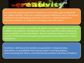 The document discusses the impact of assessment on students' creativity, highlighting how it can restrict or support creative expression. It emphasizes the importance of fostering creativity in classrooms through confidence, respect, enjoyment, and allowing time for reflection. Educators are encouraged to create an environment that values creativity, incorporates diverse thinking, and invites community involvement.