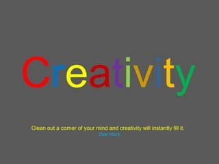 Creativity requires clearing out distractions to make room for new ideas. According to Dee Hock, being creative means emptying part of your mind so that creativity can take its place. His quote suggests that creativity will naturally emerge if you clear a space for it in your thoughts.