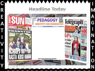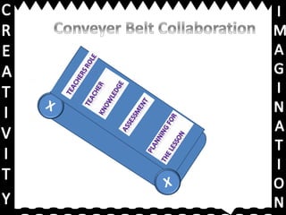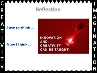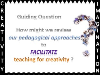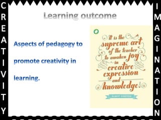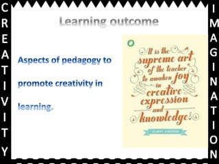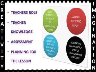 This document discusses core skills for teachers, including seeing students as partners in constructing learning, supporting rigor and effort, and working towards outcomes with real-world value. It encourages generating imagination and engaging dialogue. It provides links for viewing peer work, a further learning video, and a presentation on creativity and imagination.