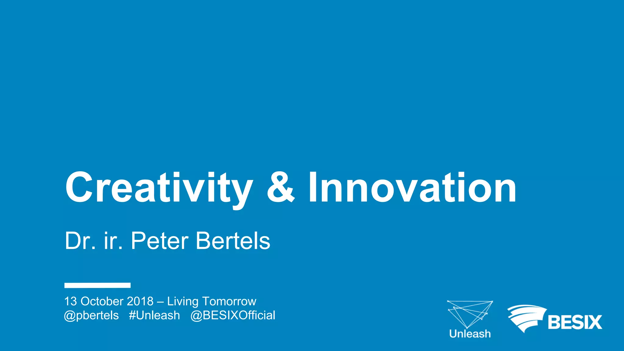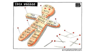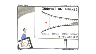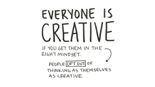 This document discusses creativity and innovation. It introduces the RISE2 innovation model which consists of four steps: reflection, ideation, selection, and execution & embedding. For each step, key aspects are outlined such as thinking about problems and expectations in the reflection stage. The selection stage involves using a COCD idea selection box to evaluate ideas. Execution involves maintaining energy and excitement through a project. The goal of embedding is ensuring 36-92% of successful innovations come from outside a company. Overall, the document presents an innovation process model and discusses considerations for each stage to foster creativity.