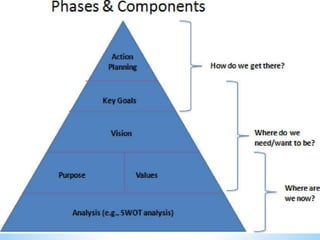3) Elements of strategic planning include analyzing strengths/weaknesses, defining purpose and vision, identifying values and goals, and creating action plans.