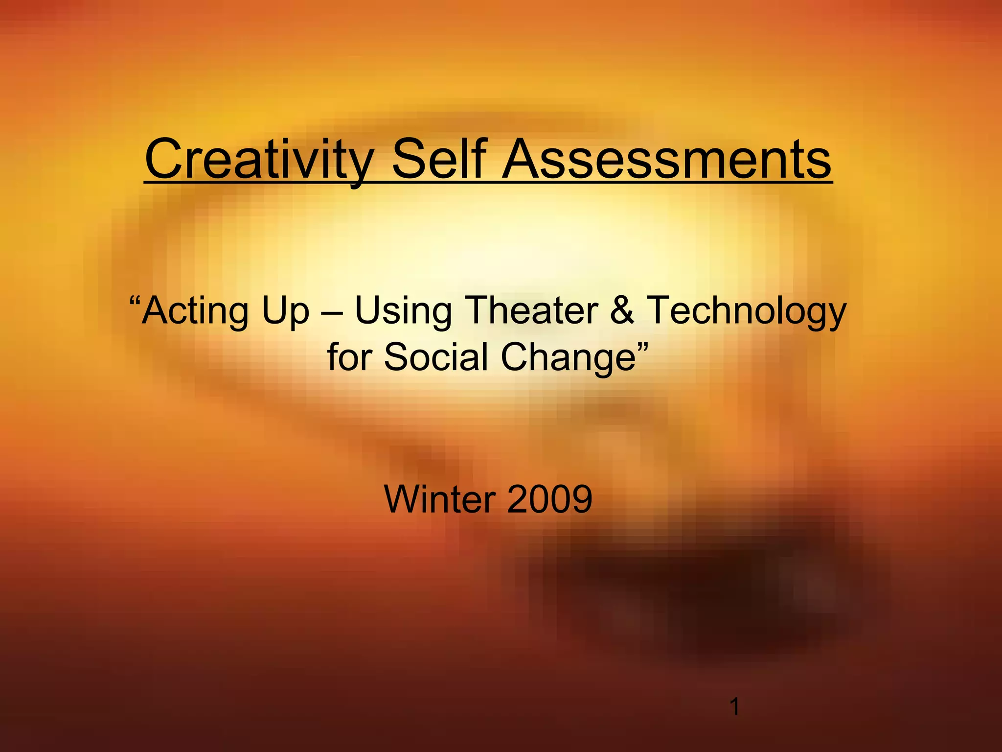 The document outlines eight key qualities identified in an online creativity self-assessment, including abstraction, connection, perspective, curiosity, boldness, paradox, complexity, and persistence. These traits are framed within the context of creativity and social change in theater and technology. Each quality is described in terms of its relevance to creative thinking and problem-solving.