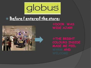 The document describes visits to several stores with observations about the environment, personnel, products, customers, and other details. The first store appeared inviting with bright colors that put the visitor in a positive mood. Personnel were friendly and the space was spacious. The second store had a formal atmosphere with employees in uniforms and high-end jewelry displayed. Customers tended to be older women browsing alone or with others. The third was an electronics store with a bright interior, loud music, and helpful male employees. Products were arranged from low to high prices with sales prominently displayed. Customers of all ages came to inquire about items.