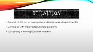 Creativity involves turning new ideas into reality, improving solutions, and motivating customers. There are seven creative strategies: generic does not differentiate brands; pre-emptive claims attributes for one brand; unique-selling-propositions highlight unique benefits; brand-image emphasizes psychological differences; positioning directly compares products; resonance appeals emotionally; and emotional plays on feelings. The creative process has five stages: developing a brief outlining the message and audience; writing copy to engage the audience; developing visuals supporting the message; creating the advertisement; and launching the campaign over time.