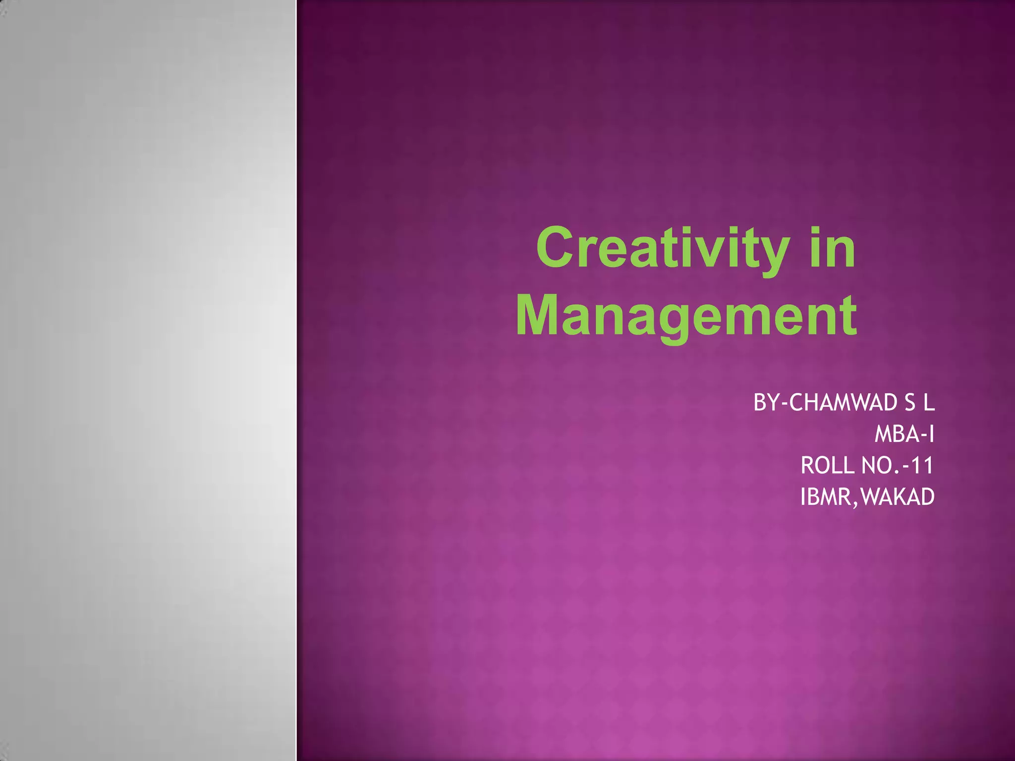 The document discusses creativity in management. It defines creativity as the reorganization of experience into new configurations, involving knowledge, imagination, and evaluation. Creativity involves three domains - art, discovery, and humor. The document also discusses how the two hemispheres of the brain process information differently and their relationship to creativity and innovation. It provides tips for enhancing creativity, including keeping a notepad, using the internet, and maintaining an organizational environment that supports creativity.