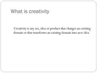 Creativity involves changing or transforming existing ideas into new ones. The creative process involves preparation, incubation, insight, evaluation, and elaboration. Sources of creativity include belief, lack of judgment, observation, questioning, stillness, self-knowledge, objectivity, supportive environments, knowledge, experience, and flow. To make oral communication creative, one should analyze the audience, find relevant material, appeal to them, review the speech, and use visual, vocal, and verbal elements to support it.