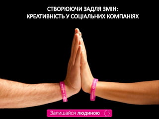 Presentation created for the Working Group Creativity in social campaigns « Balance between Attracting and achieving/Creating for change». Working Group was moderated by Dzvenyslava Novakivska. It was main component of the Final Conference 'Women and Children's Rights in Ukraine - Communication component'