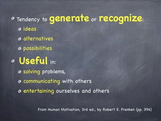 Creativity involves generating new ideas, possibilities, and alternatives. It is motivated by needs for novelty, problem-solving, and self-expression. To be creative, one must view things from different perspectives and generate new possibilities. Creativity produces novel and valuable outcomes and involves the capacity to generate new ideas or patterns that change existing domains. For something to be truly creative, it must not only be novel but also have value and be appropriate to its situation or context.