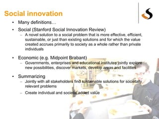 The document discusses social innovation as a collaborative process involving diverse stakeholders to find effective solutions to societal problems. It presents collaboration patterns as reusable lessons learned that aid in the socio-technical design of social innovation initiatives. The author emphasizes the need for careful analysis and design to enhance the scalability and sustainability of social innovation efforts.