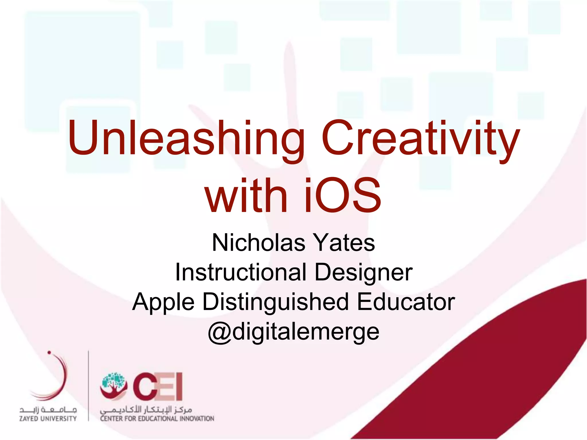 This document discusses how to unleash creativity with iOS. It introduces the creative process, which includes generating ideas, capturing ideas, collecting select ideas, and realizing one idea. The creative process can support student creativity when implemented in the classroom. Multiple intelligences like verbal-linguistic, logical-mathematical, and visual-spatial can also support student creativity when used to allow students to demonstrate their knowledge and skills through creative means like podcasts, videos, 3D modeling, or teaching others. The overall challenge is how students can creatively demonstrate their knowledge and skills.