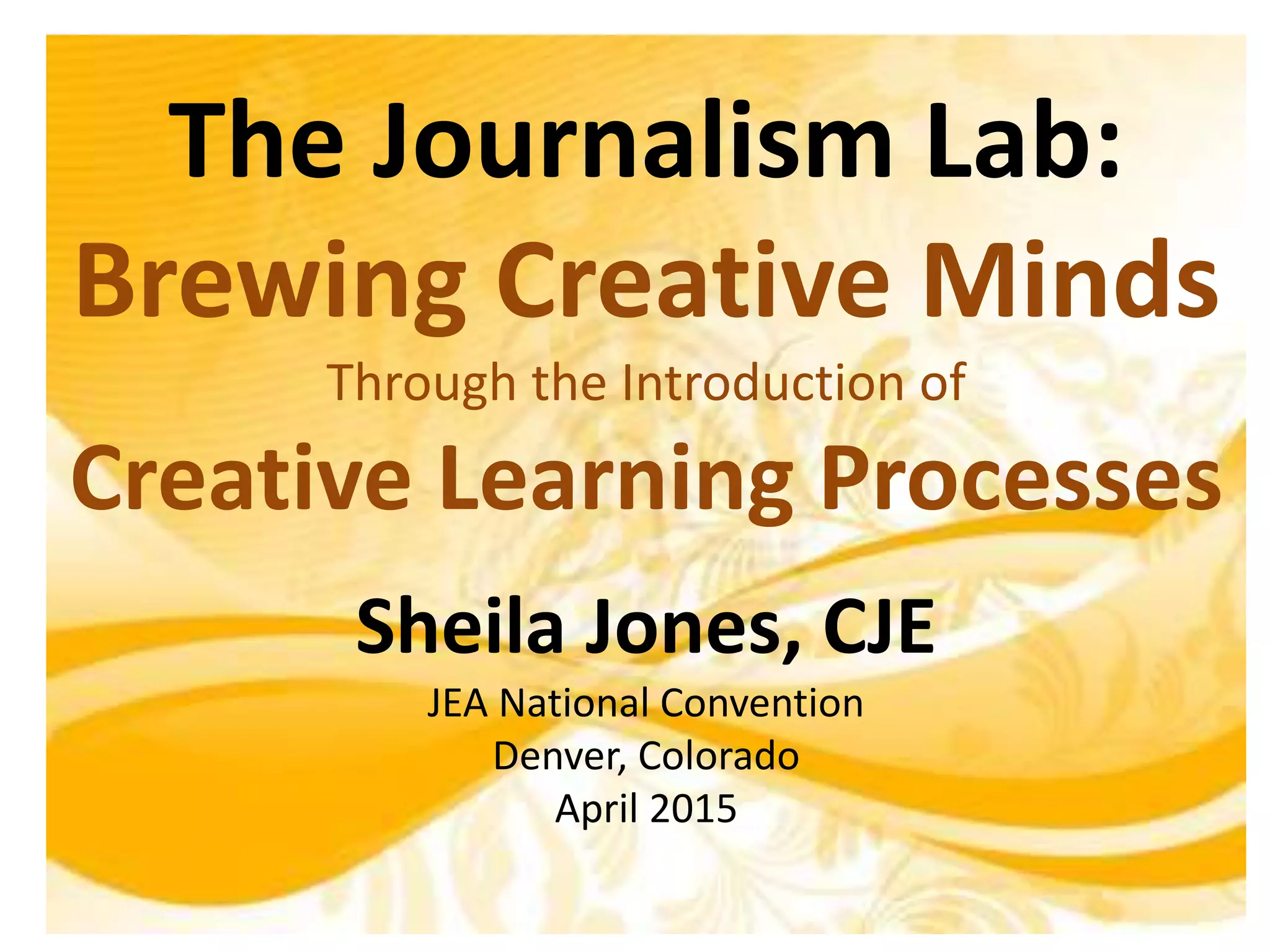 The document summarizes Sheila Jones' presentation at the 2015 JEA National Convention on introducing creative learning processes to journalism. It discusses how creativity and journalism can coexist by using both divergent and convergent thinking. It debunks common myths about creativity and outlines three creative training processes - Creative Problem Solving, Design Thinking, and DeGraff's 5 Levels of Creativity - that can be applied to journalism. The goal is to help students generate original story ideas by alternating between generating many ideas and narrowing them down.