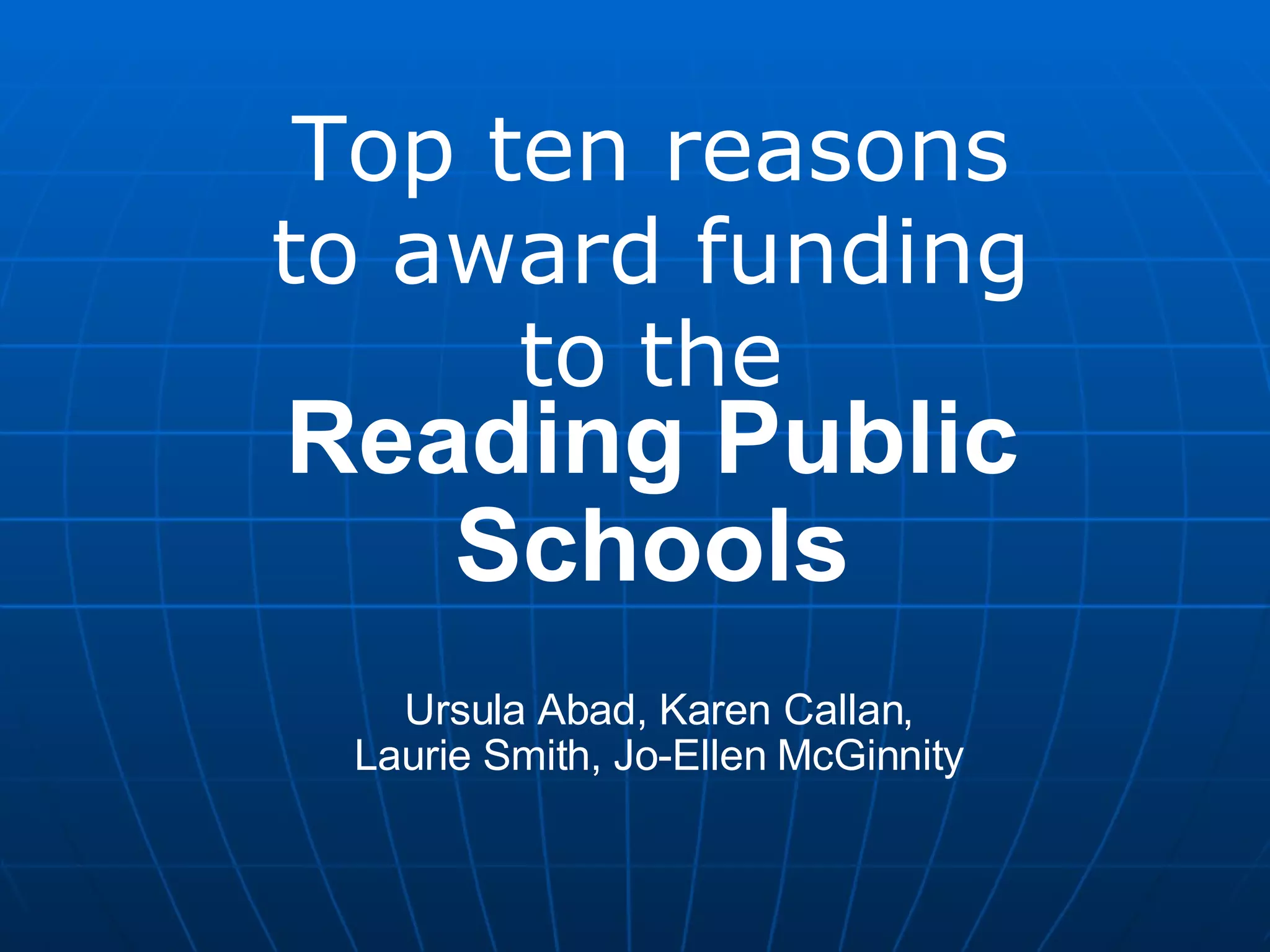 The document makes the case for awarding funding to the Reading Public Schools. It lists the top ten reasons, including making the schools fully wireless with technology for every student, support from full-time technicians, green buildings and classrooms conducive to learning, standards that address critical thinking, and preparing students for 21st century careers through internships and project-based learning. It also outlines plans for staff training, community involvement, and helping students become leaders of the 21st century.