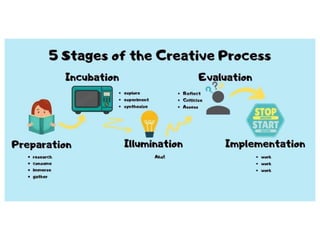 Creativity is goal-directed thinking that produces novel and useful ideas. It involves both convergent and divergent thinking. Convergent thinking finds single solutions, while divergent thinking generates many possible solutions. There are various stages of creativity including preparation, incubation, illumination, verification and revision. Wallas proposed five stages: preparation, incubation, illumination, verification and revision. Creativity can be obstructed by fears of rejection, but it simplifies complexity by finding elegant solutions.