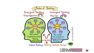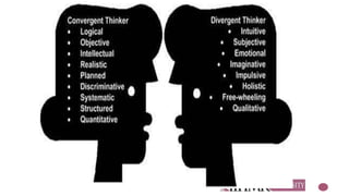 This document discusses qualities of creative people and the creative personality. It notes that creative individuals are different, playful, adventurous, have a sense of humor, see things others don't, and are passionate. The creative personality equation balances core creative traits with motivation to create against fears and disabilities that impede creativity. It also cautions that to be creative requires a weak need for security and status. Common blocks to creativity include fear of failure, allergy to ambiguity, touchiness, conformity, and rigidity. The document outlines abilities related to creativity like fluency, flexibility, originality, and elaboration. It provides suggestions for developing these abilities and lists strategies for unblocking creativity such as awareness, analysis, goal setting