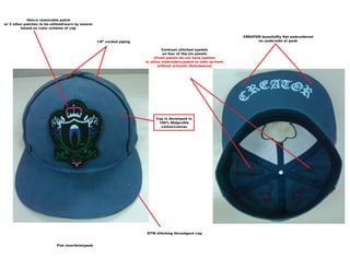 This document describes a baseball cap with removable Velcro patches and embroidery. The cap has contrast stitched eyelets on four panels and a flat visor. It is made of 100% cotton canvas and has DTM stitching throughout. The removable Velcro patches allow the wearer to change the color scheme based on the cap's color.
