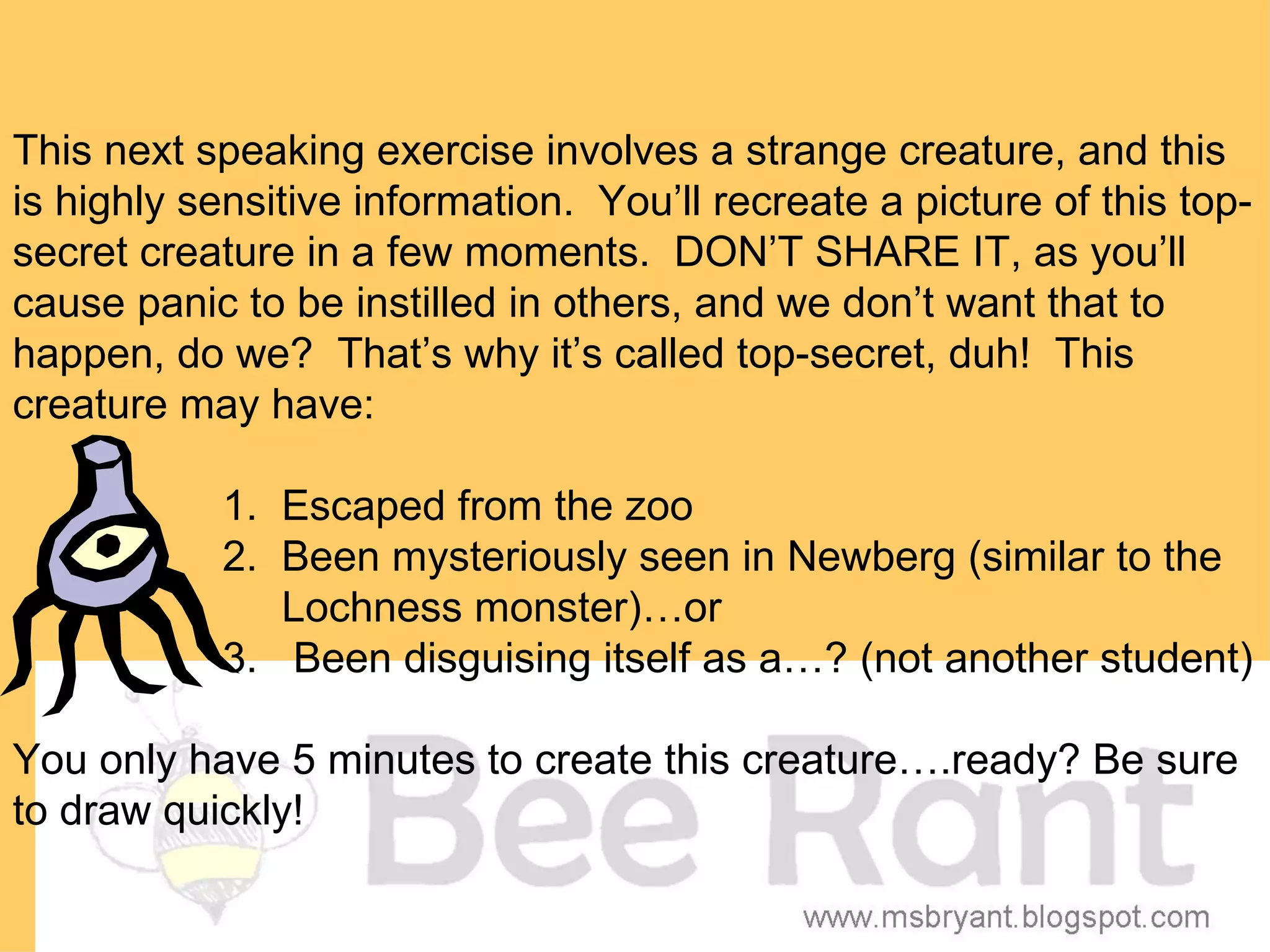 The document provides instructions for students to create and present a poem warning others about an escaped creature from the zoo. Students are guided to draw the creature, describe its features in rhyming words, and practice performing the warning poem with expression and gestures. The goal is for students to collaboratively write, illustrate, and present an entertaining rhyming poem about the mysterious creature.