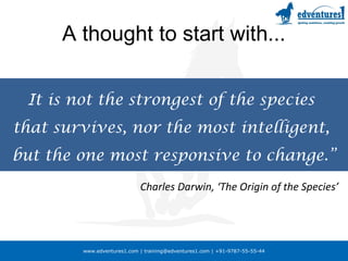The document discusses a training session on creativity in business. It begins with a quote from Charles Darwin about adapting to change. The agenda includes understanding creativity, its relationship to business, and tools and discussions. Mental blocks to creativity like seeking a single right answer or thinking ideas are not practical are examined. Creativity is defined as seeing things differently. Creativity is important for businesses facing change, technology, competition and survival. Examples challenge linear thinking and show how creativity can solve problems.