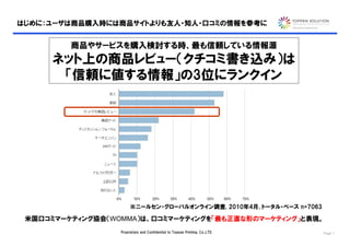 商品やサービスを購入検討する時、最も信頼している情報源 ネット上の商品レビュー(クチコミ書き込み)は 「信頼に値する情報」の3位にランクイン ※ニールセン・グローバルオンライン調査, 2010年4月, トータル・ベース n=7063 米国口コミマーケティング協会(WOMMA)は、口コミマーケティングを「最も正直な形のマーケティング」と表現。 Proprietary and Confidential to Toppan Printing, Co.,LTD. Page 1