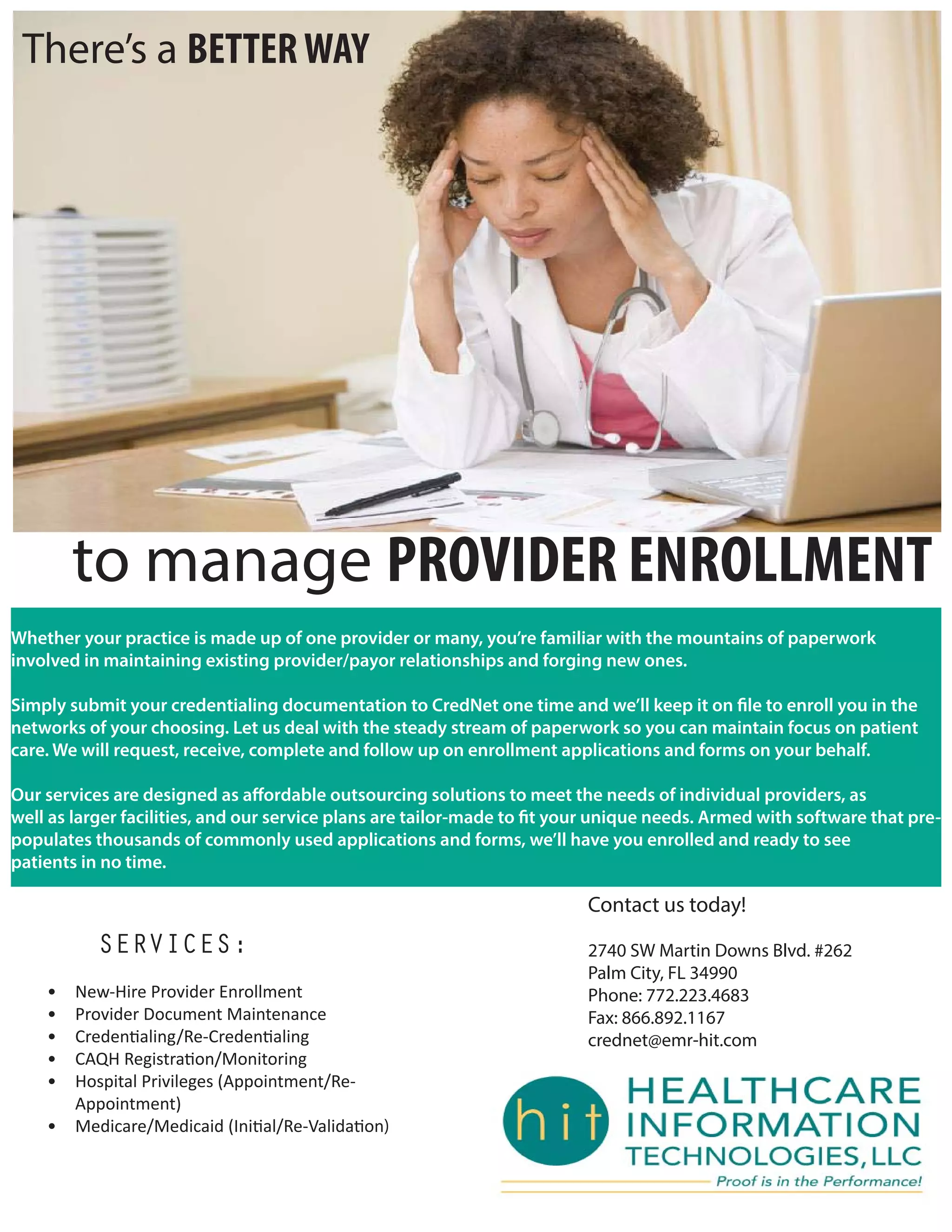 CredNet provides provider enrollment services to simplify the credentialing and enrollment process. Their services include new provider enrollment, document maintenance, credentialing, CAQH registration, hospital privileges, and Medicare/Medicaid enrollment. Submitting credentialing documentation to CredNet once allows them to enroll providers in various networks to reduce paperwork burdens. CredNet works on behalf of providers to complete and follow up on all necessary enrollment applications and forms.