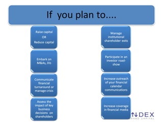 Index Brand Capital provides branding and public relations services to help companies in the financial sector build their enterprise value and create winning brands. They have experience working with listed and unlisted companies across various industries. Their services include reputation management, financial communications, investor relations, issue management, and crisis communication. Index Brand Capital is affiliated with Sampark Public Relations, one of the top five PR firms in India which has over 15 years of experience and a network of offices across the country.