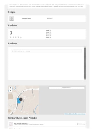 Horn Law Firm, P.C., founded in 1992, is located at 19049 E Valley View Pkwy, Suite J, Independence, MO, and employs six people with an annual revenue of approximately $650,000. The firm's contact number is (816) 795-7500, and additional information can be found on their website. Their business hours are Monday to Friday from 8:00 AM to 5:00 PM.