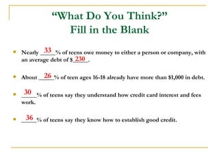 This document discusses credit and managing personal finances responsibly. It covers key topics like the advantages and disadvantages of using credit, applying for and establishing credit, maintaining a good credit history and credit report, and the consequences of excessive debt. Specific areas covered include different types of credit (credit cards, loans, mortgages), understanding interest rates and fees, building creditworthiness, checking your credit report and score, and the risks of poor credit management.